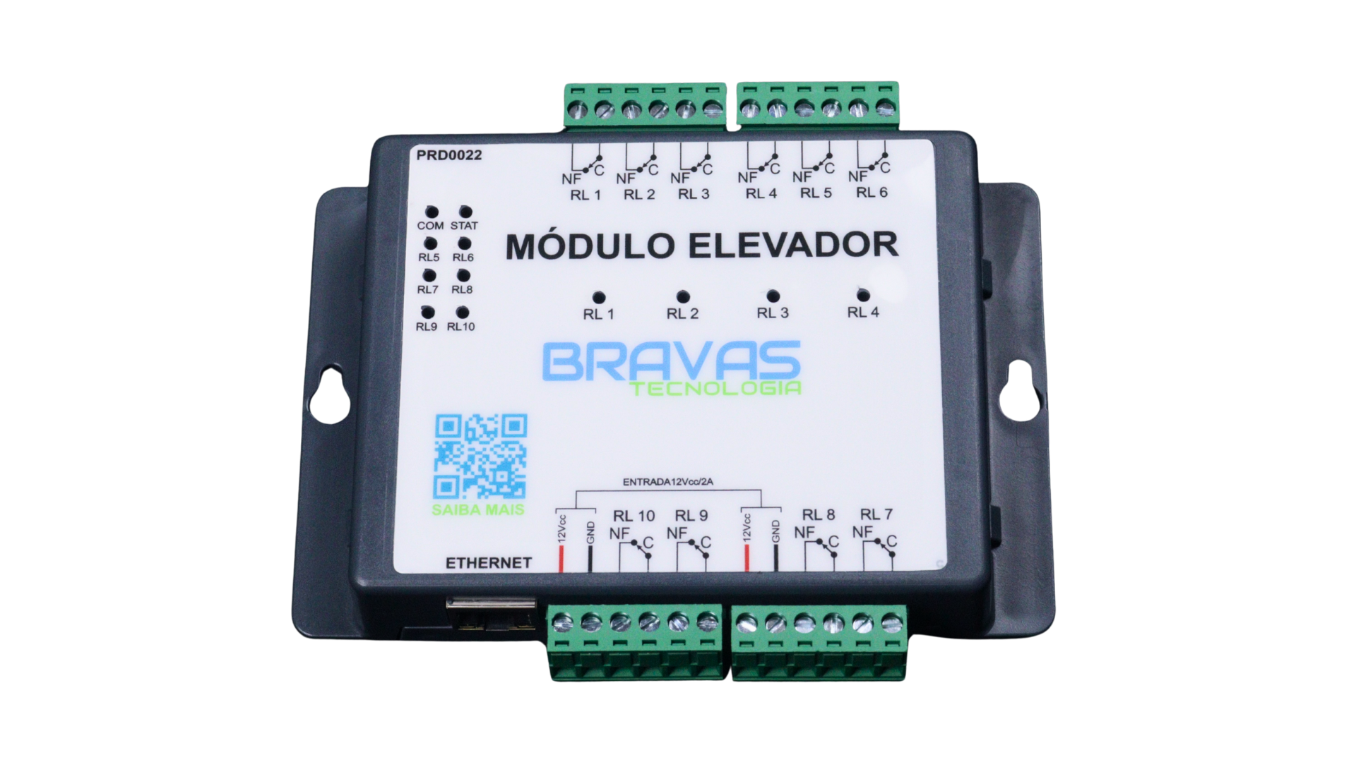 O Módulo Elevador (PRD0022) é a interface de automação predial para elevadores. Possui 10 saídas Relé SPST 1A e se conecta via Ethernet ao Módulo Acesso Programável PRD0028 para configurar as regras de controle. Sua função é inibir o acionamento dos andares, liberando-os somente após a identificação e autorização do usuário. A ligação elétrica dos relés é feita em série ou no lugar dos botões de chamada do elevador, depende do tipo de uso. Deve-se usar um Módulo a cada 10 andares. Em caso de falha, o elevador retorna ao funcionamento convencional.